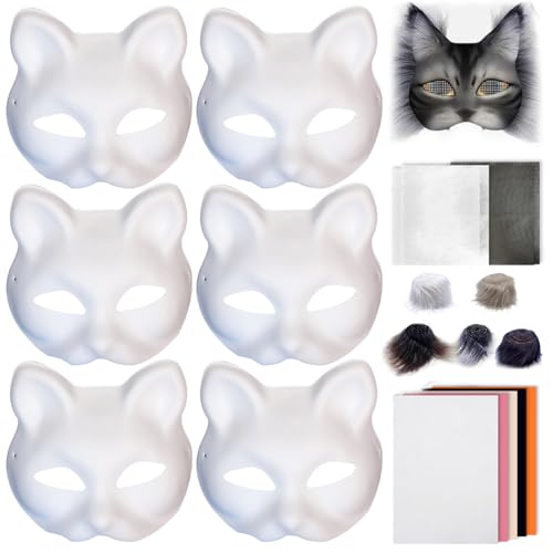 6 stycken kattmasker med ögonnät och päls skägg, djur katt mask gör-det-själv set kattmasker att måla filt, mask konsthantverkssats, gör-det-själv blank ansiktsmask kostym för maskerad