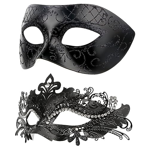 MYSEUNI Maskeradmask för par – romersk grekisk man mask & venetiansk metall dammask för maskeradbal Mardi Gras Halloween, svart, en storlek