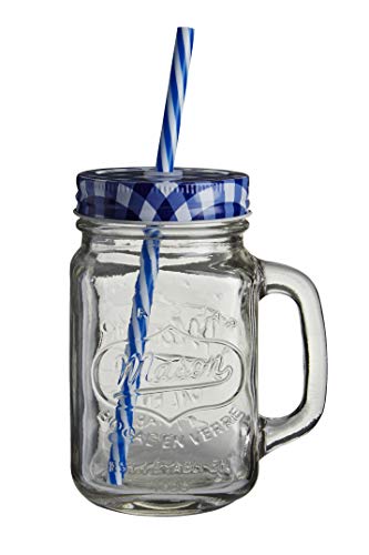Premier Housewares Burk mugg präglad Mason Jar mugg, fyrkantigt klart glas, blått ginghamlock klart