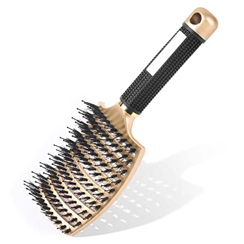 URAQT hårborste, naturlig vildsvinsborst paddelhårborste för kvinnor och män, skonsam massage hårkam, professionell hårborste för långt tjockt lockigt hår, minskar håravbrott och friss (Guld)