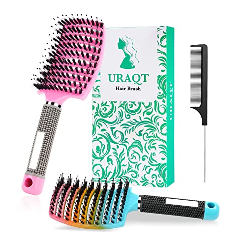 URAQT hårborste, 2 stycken naturlig vildsvinsborst paddelhårborste presentlåda kostym för kvinnor och män, skonsam massage hårkam, professionell hårborste för långt tjockt lockigt hår, minskar håravbrott och friss (lila + rosa)