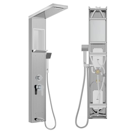 JNGLGO Duschpanel rostfritt stål duschsystem silver med termostat duschpelare duschset borstad duscharmatur för badrum – regndusch handdusch massagedusch vattenfallsdusch (silver)