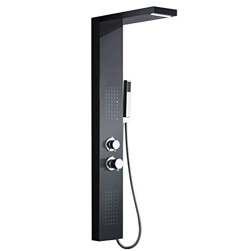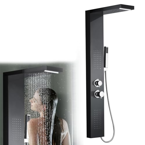 JNGLGO Duschpanel rostfritt stål duschsystem svart med termostat duschpelare duschset borstad duscharmatur för badrum – regndusch handdusch massagedusch vattenfallsdusch (svart)
