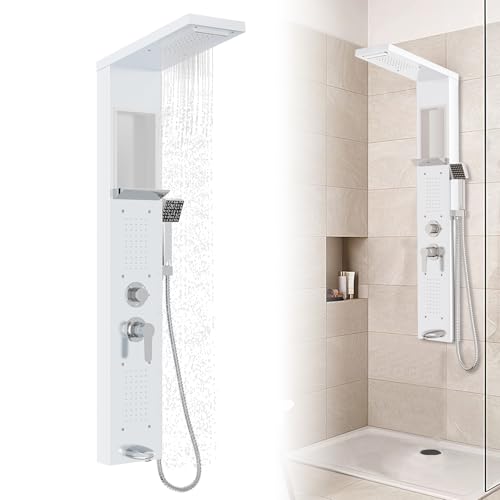 Froadp Duschpanel regndusch rostfritt stål duschsystem 5 funktion väggmonterad duschset med handdusch, regndusch, massagedusch, vattenfalldusch, duscharmatur komplett set (vit)