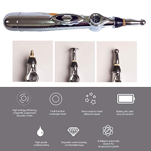 Akupunkturenergipenna, pulslindrande massagepenna med 5 massagehuvuden, smärtlindringsterapi, elektriska meridianer, energipenna för smärtlindring, nio effektnivåer