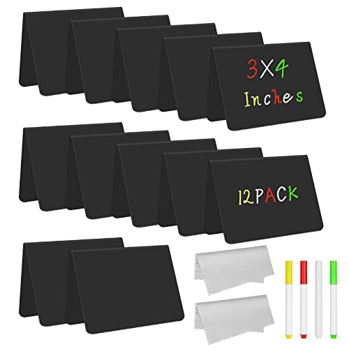 Vicloon svarta tavlan skyltar, 12 st svarta tavlan skyltar med 4 raderbara tavlan pennor 2 rengöringsduk Matställ Etiketter Bufféetiketter för mat, prislappar, skola, bröllop, fest(A-Shape)