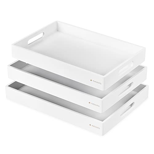 Navaris serveringsbricka i bambu – 3 x brickor med handtag för drycker, mat, te, frukost i säng, äta på knäet – stort medium litet brickset – vit