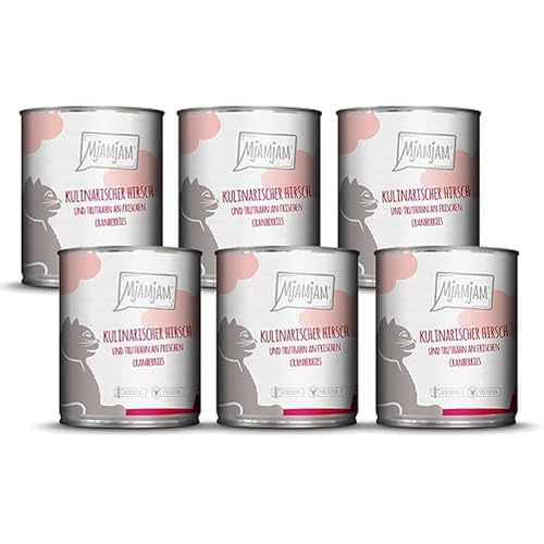 MjamJam Premium våt mat för katter kulinarisk hjort och kalkon på färska tranbär, förpackning med 6 (6 x 800 g), kornfri med extra stor kött