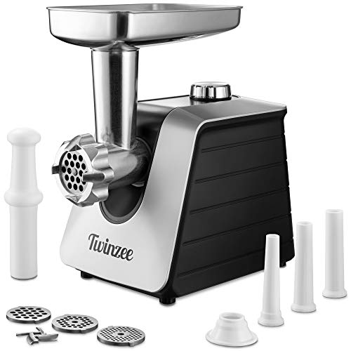Twinzee - Elektrisk köttkvarn med korvfyllmedel 1500W, vit - För kött och korv - Matberedare, köttkvarn med 3 perforerade skivor och 3 korvfästen