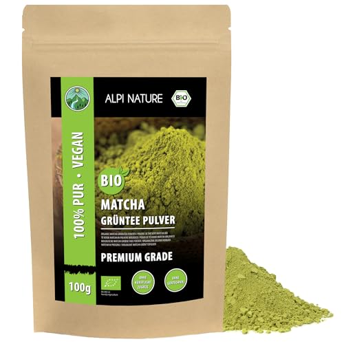 Alpi Nature EKOLOGISKT Matcha pulver (100g), Matcha grönt te premium kvalitet, Matcha blad torkade och malda från kontrollerad ekologisk odling, 100 procent naturligt och veganskt, utan tillsatser