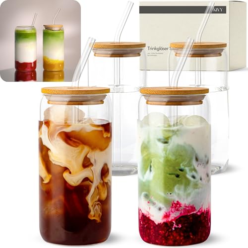 KIVY Dricksglas set med glas sugrör [4 x 450 ml] för iskaffe, vatten och cocktails – longdrinkglas – iskaffeglas – kaffeglas – iced Coffee glass – matcha & kaffeglas