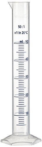 Märke polypropylen mätcylinder, hög form, sexkantsfot, transparent, 200 mm höjd, 50 ml kapacitet