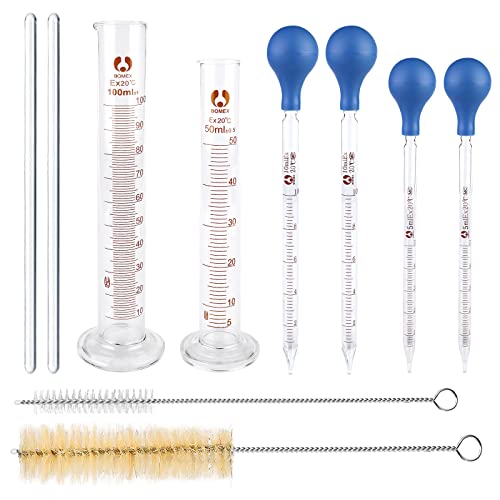Mätcylinder glas, 10 st tjockt glas, graderade glasmätcylinder, set med 4 mätcylindrar, 5 ml/10 ml/50 ml/100 ml 3 glaspipetter 1 glasstång, 2 borstar för provrör för laboratorium livsmedel, forskning