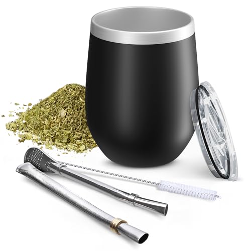 Aquafloow Yerba Mate-Mugg 350 ml + 2 Stycken Sugrör i Stål, Dubbelväggig Yerba Mate-Kopp | BPA-fritt Lock, Teservis i Rostfritt Stål för Mate, Yerba – Svart