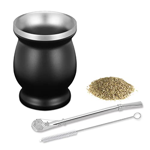 thirei Matekopp, med sugrör och rengöringsborste, mate-teset lämplig för kök, restaurang, café, svart