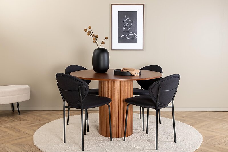 Noira Matbord 120 cm Massiv Valnöt Runt med 4 Kalb Matstolar Brun