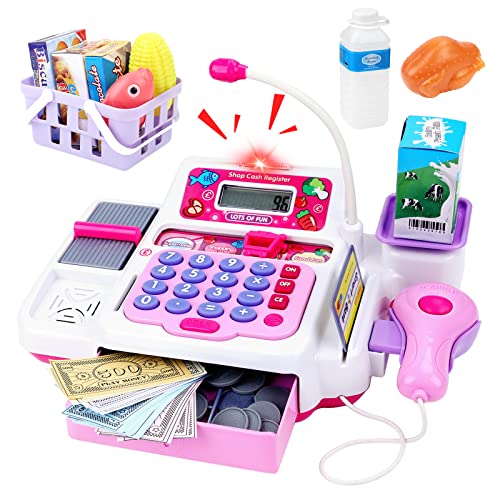 deAO Stor och rosa mataffärs leksakskassa med tillhörande kreditkort, skanner, matkorg, och livsmedelsvaror