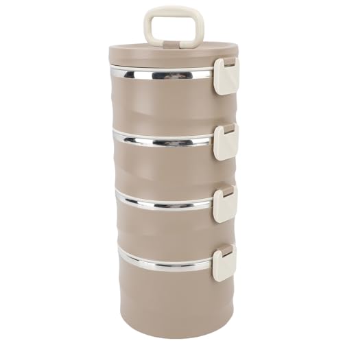 4-vånings Matbehållare, 3,3 L 4-vånings Isolerad Matlåda 304 Matbehållare i Rostfritt Stål Rund Stapelbar Bento-låda med 2 Integrerade Gaffelskedar (Brun)