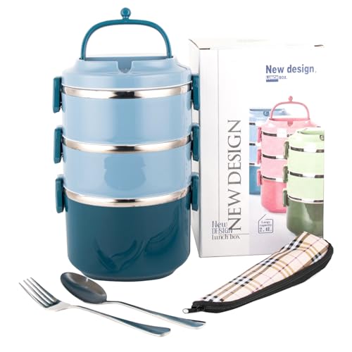 SANQIAHOME 3 lager matlåda i rostfritt stål, läckagesäkra matbehållare, stapelbar lunchlåda för vuxna blå Bentoboxar Lunchlådor