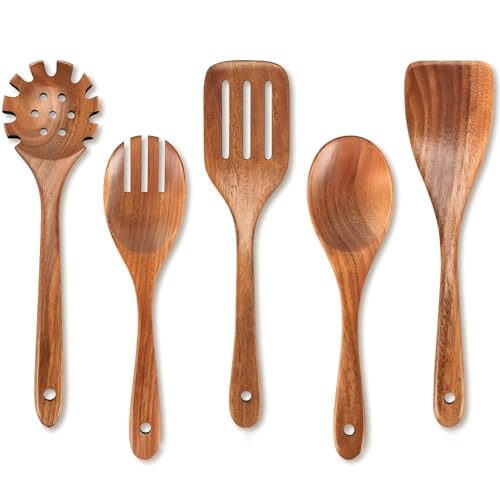 Premium teakträ matlagningsredskap, 5-delat set med långa handtag, non-stick, perfekt för köksredskap