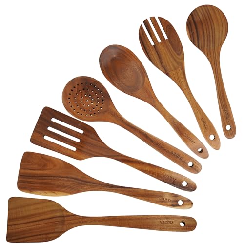 Zebten 7-delars Köksredskap i Trä - Naturlig Teak, Miljövänliga Matlagningsredskap Med Skedar - Ekologiskt Set