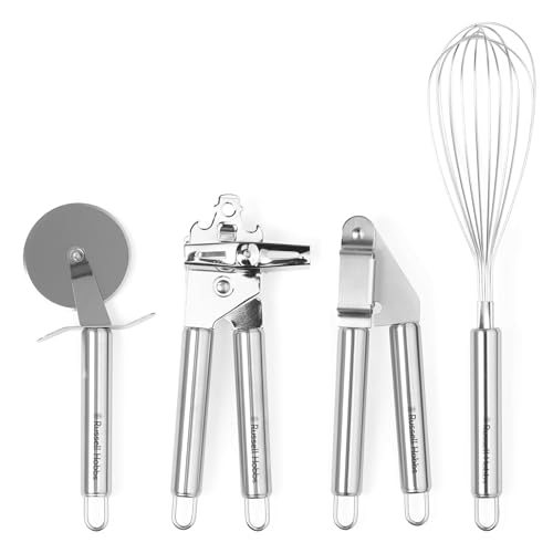 Russell Hobbs RH00124EU Köksverktygssats – 4 delar rostfritt stål Essential matlagningsredskap och redskap, pizzaskärare, visp, burköppnare, vitlökspress/krusher, lätt att rengöra, hängande krokar,
