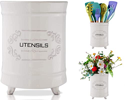 Fransk vit keramisk redskapshållare – vintage stil köksredskapslåda – antik design matlagningsredskap organisatör – rustik fransk lantlig redskap för matlagning entusiast