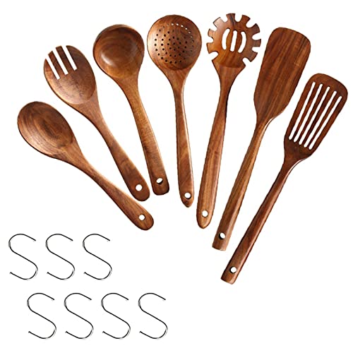 7-pack köksredskap i trä, naturlig teak trä kök spatel set för matlagning trä matlagningsredskap träspatlar för matlagning (inkluderar 7 st krokar)
