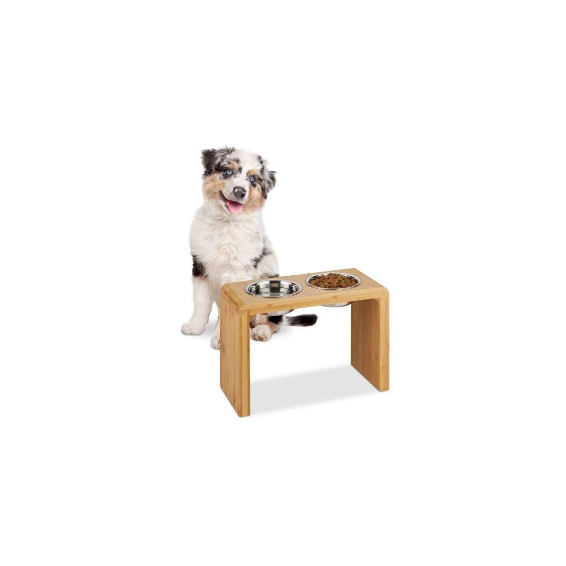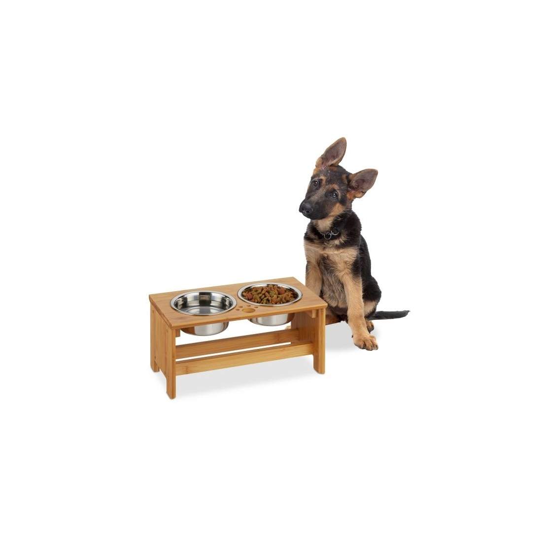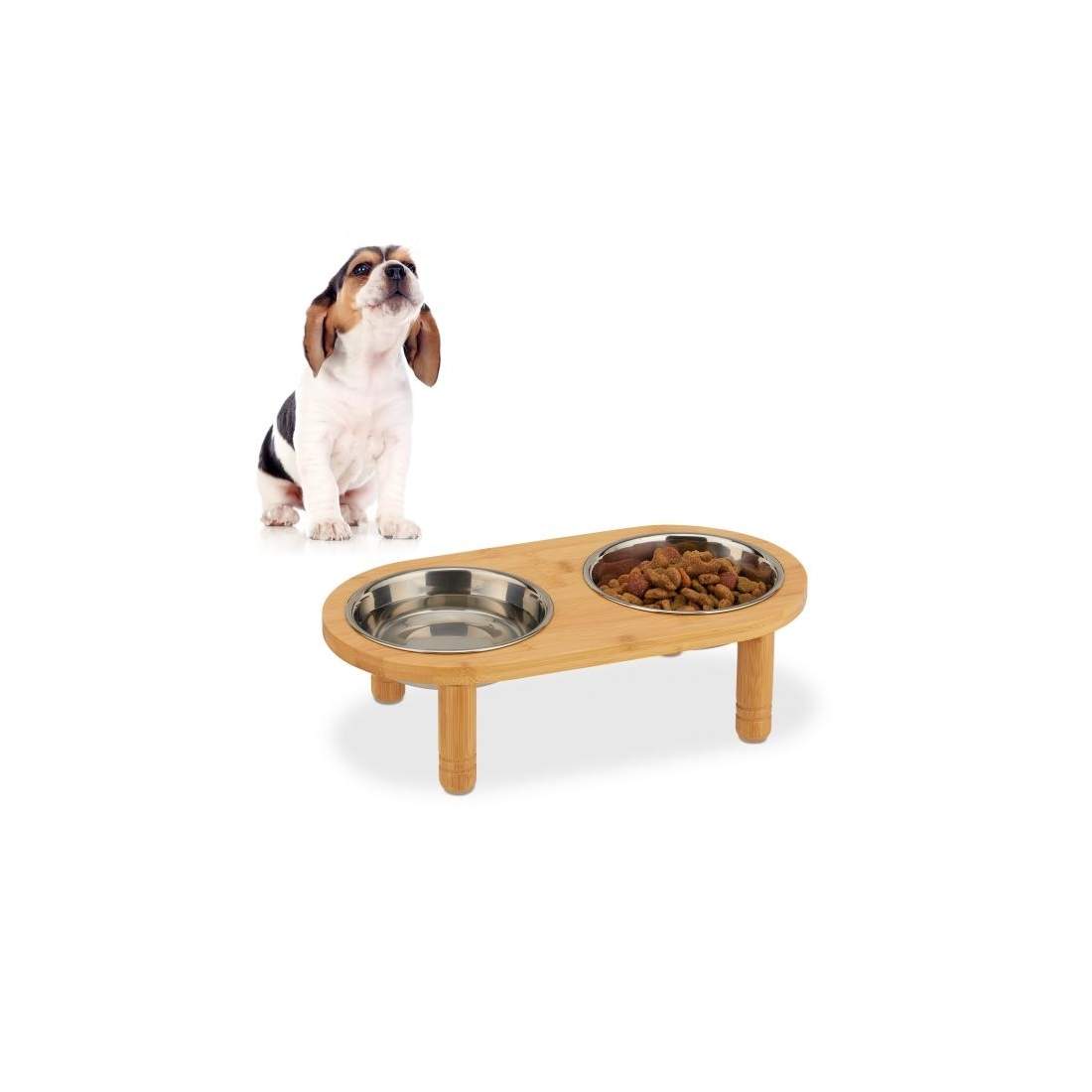 Relaxdays Hundfoderstation, upphöjd hundbar, 2 matskålar av rostfritt stål, 750 ml, mangoträ och järn, brun/svart