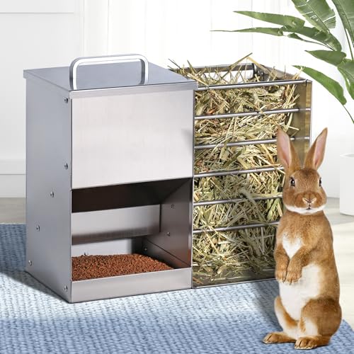 MOGOULUA 3-i-1 kanin hö foderstation med rostfritt stål kattlåda och 2 stuckatur matskålar för husdjur höra för små husdjur kanin hamstrar marsvin