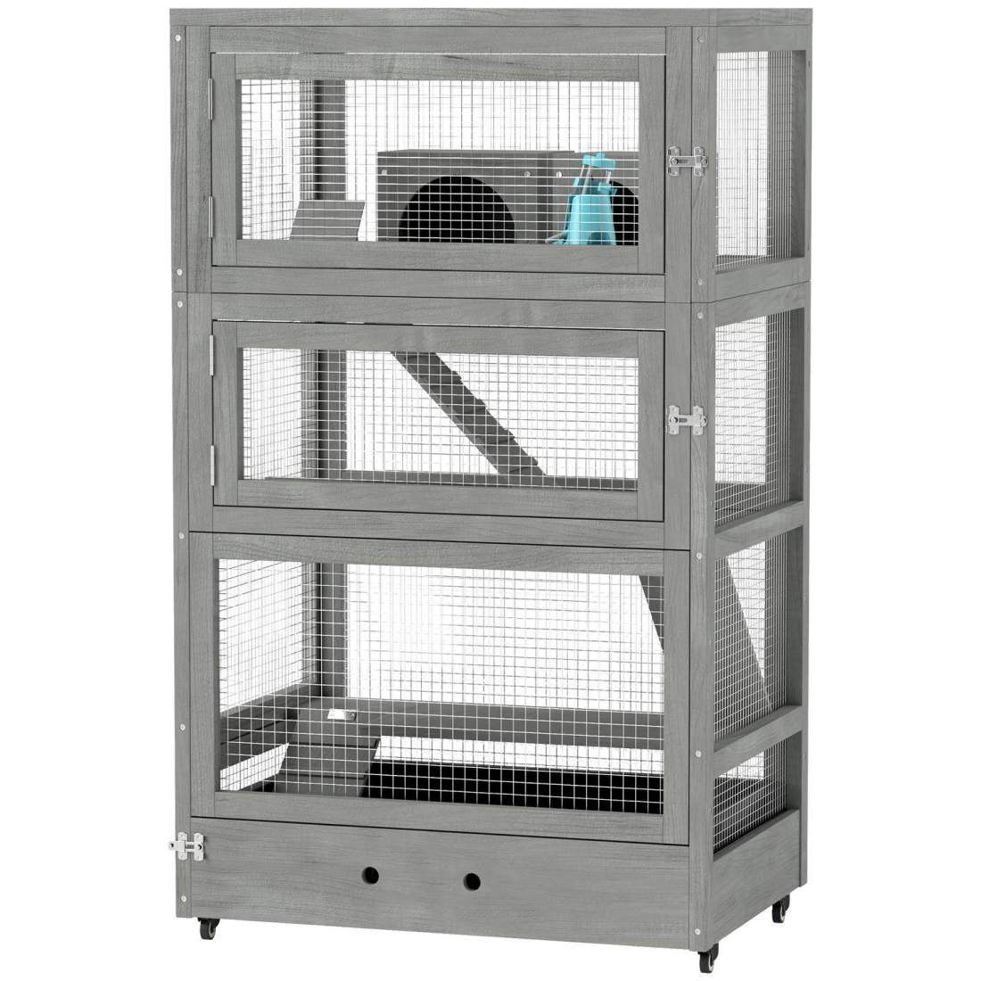 Dvärghamsterbur av trä, 65 x 45 x 109 cm gnagarbur med hyddor, rocker, pall, matskålar, 4-vånings smådjursbur med lås, ramper, h