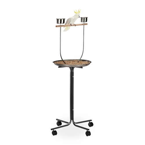 Relaxdays Frisits för papegojor, startstång, 2 matskålar, rullbar, nymfparakiter, HBT: 130 x 60 x 60 cm, silver