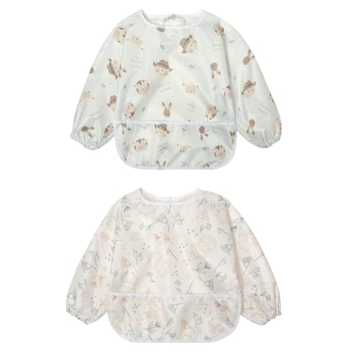 Little Dimsum hel ärm matningshaklapp 2-pack, baby och småbarn vattentätt haklappförkläde, matskydd stor ficka äta smock 6-48 månader (hatt björn och uggla)