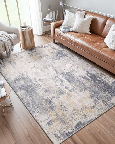 DEFYNEE Abstrakt matta vardagsrum 240 x 300 cm, halkfri, kort lugg av konstgjord ull, tvättbar, minimalistisk, sängmatta för vardagsrum, sovrum & kontor, grå-gul