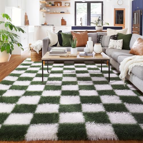 BYBSRLL Rutiga vardagsrumsmattor, 240 x 300 cm olivgrön och vit fluffig sovrumsdekoration barnmatta, hög lugg sängmatta, löpare, tvättbar, halkfri gosig matta, stor