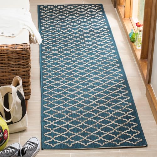 SAFAVIEH Geometrisk matta för vardagsrum, matsal, sovrum - vattentät - Courtyard Collection, korthårig, marinblå och beige, 69 x 244 cm