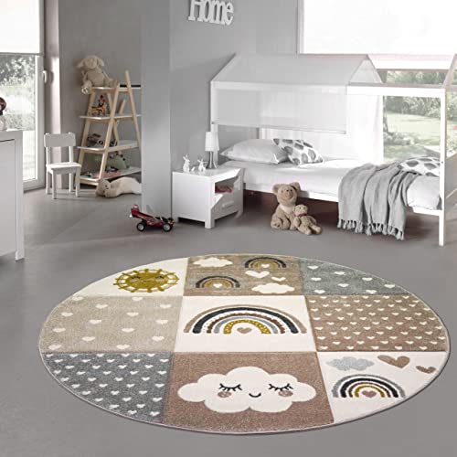 Matta dröm rund barnrum matta lekmatta regnbåge hjärtan moln beige grå brun storlek 120 cm rund