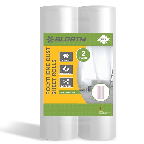 BLOSTM Dammark i plast för dekoration – 3 m x 50 m stora plastplåtrullar 2 st för användning som möbel- och mattskydd för dekoration och gör-det-själv-projekt, vattentätt plastark 3 m x 50 m – 2 st