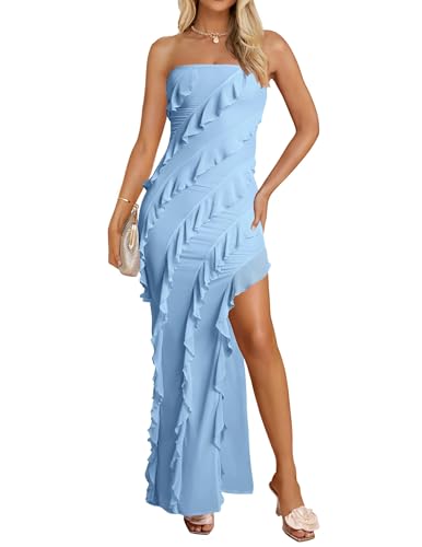 ZESICA Women's 2025 Strapless Bodycon Dress Sexy Off Shoulder Mesh Tassel Ruffle Side Split Tube Party Maxi Dresses,Blue,Small