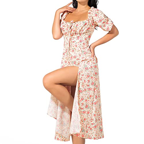 Boho klänning för kvinnor cottagecore klänning maxiklänning sommar omlott blommig vardaglig vintage fyrkantig hals volang fåll delad strandklänning, Mn 1-h005b, S