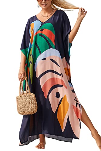 YouKD maxiklänning, v-ringad, kaftan, boho-morgonrock, strandklänning, rymliga klänningar för kvinnor, B Blad, one size