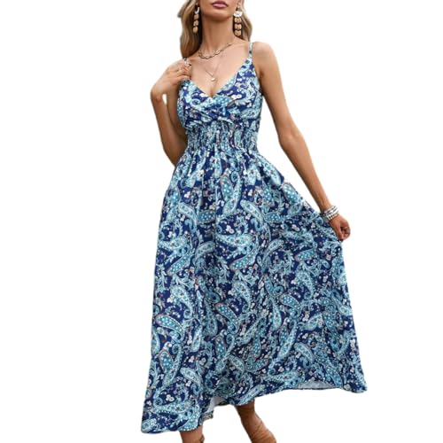 XIVISTO sommarklänning dam lång maxiklänning V-ringad boho spagettiremmar fritidsklänning blomtryck klänningar hög midja swing semester strandklänning med justerbar axelrem, blå, XL