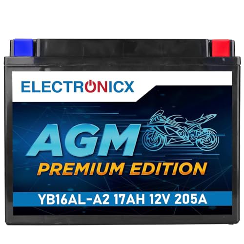 Electronicx YB16AL-A2 AGM 12V 17Ah 205A motorcykelbatteri – hållbart, högkvalitativt, förseglat, underhållsfritt startbatteri för MC, skoter, ATV, snöskoter & vattenskoter – 206×70×163 mm