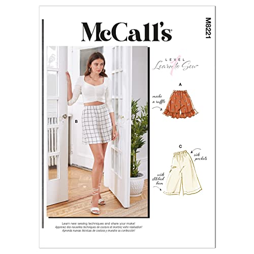 McCalls, overaller och shorts ZZ (L-XL-XXL) Misses' Elastisk midja, benbyxor. A: Beskuren med krås fåll. B: , C: Full längd. C: Kontrast