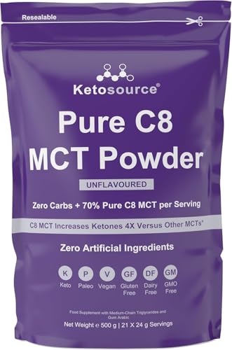 Rent C8 MCT-pulver (500 g påse) | 0g netto kolhydrater | Hög 65% ren C8 MCT oljelast | Alla naturliga ingredienser | Gluten & mejeriprodukter | Vanlig smak | Ketosource® (Osmaksatt, 500g)