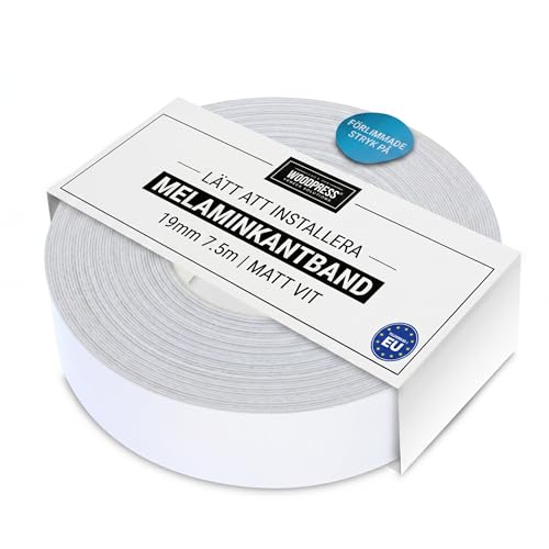 WoodPress® 19 mm matt vit melamintejp, 7,5 m rulle, kan strykas för enkel applicering, täcker kanten på en vanlig MDF-panel