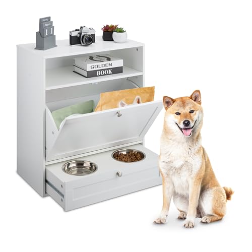 Relaxdays Foderskåp hund, låda med 2 matskålar, vippfack för djurfoder, H x B x D: 68 x 60 x 33 cm, MDF, vit