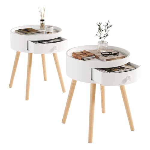 WOLTU Sängbord, uppsättning av 2, sidobord, nattduksbord, nattduksbord, soffbord, med låda, med ben, trä, MDF, vit, TS111ws-2
