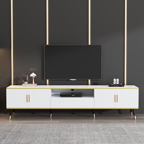 HAINEW TV-skåp, TV-bänk med 4 dörrar och 1 låda, modernt 200 cm långt TV-bord, TV-bord med marmorutseende, MDF-bordsskiva och 1 öppet fack för TV upp till 90 tum, vitt