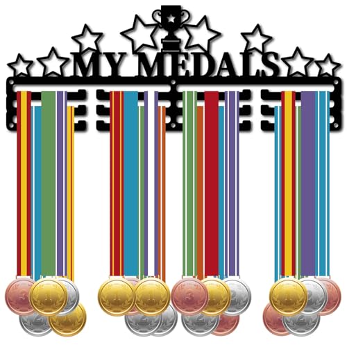 CREATCABIN Mina medaljer medaljhängare visa medaljhållare stjärna trofé hylla ram sport metall hängande idrottare utmärkelser järn väggmontering dekor över 60 medaljer för tävling band medaljer svart